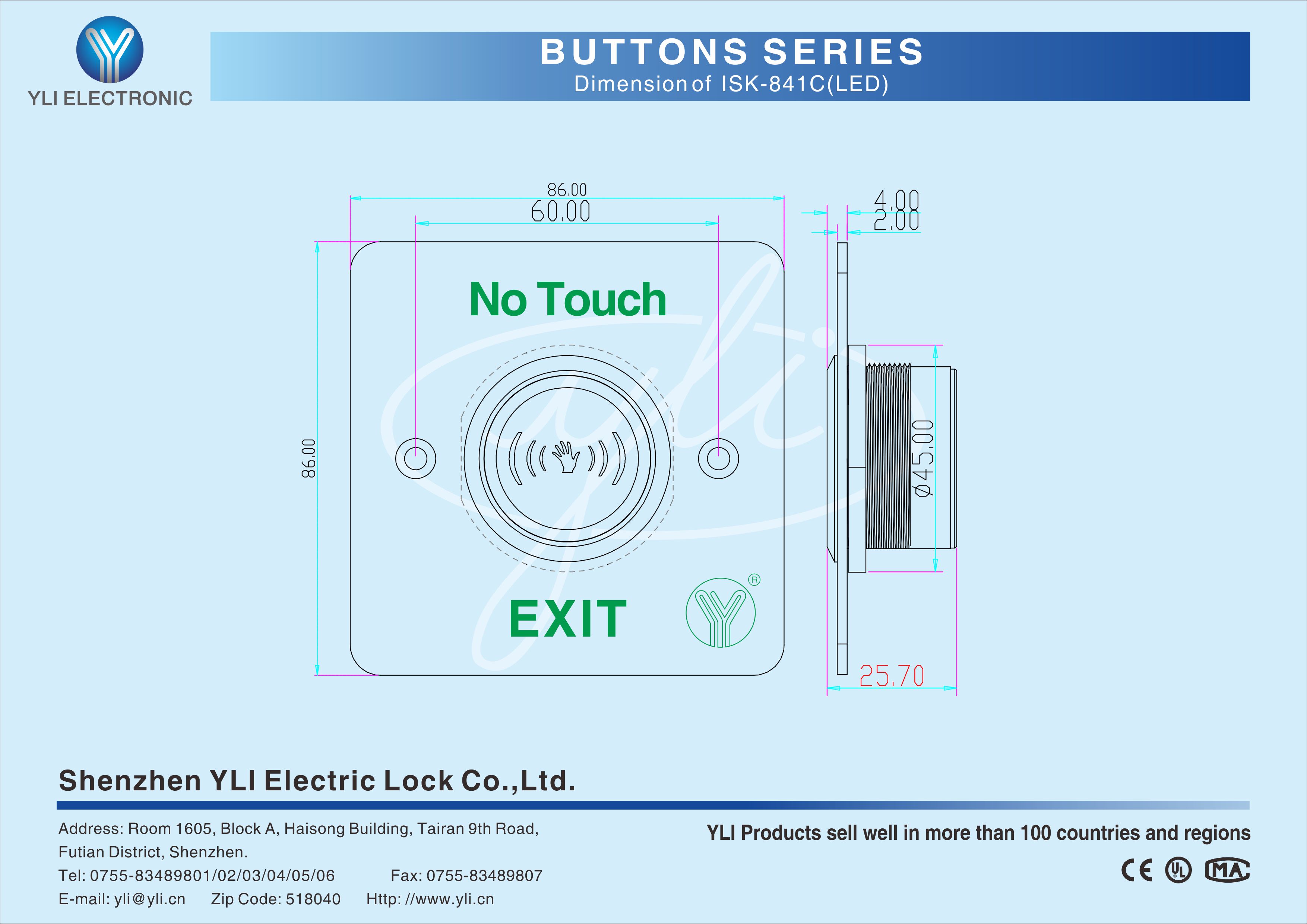 ISK-841C is an Infrared Sensor Exit Button with stainless steel in size of 86Lx86Wx25.7H(mm) suitable for all kinds of locks. 4-12cm induction distance is adjustable, 1~25S Time delay is adjustable. Red??LED indicator: Power ON(standby);Green LED indicator: Power ON(sensation).