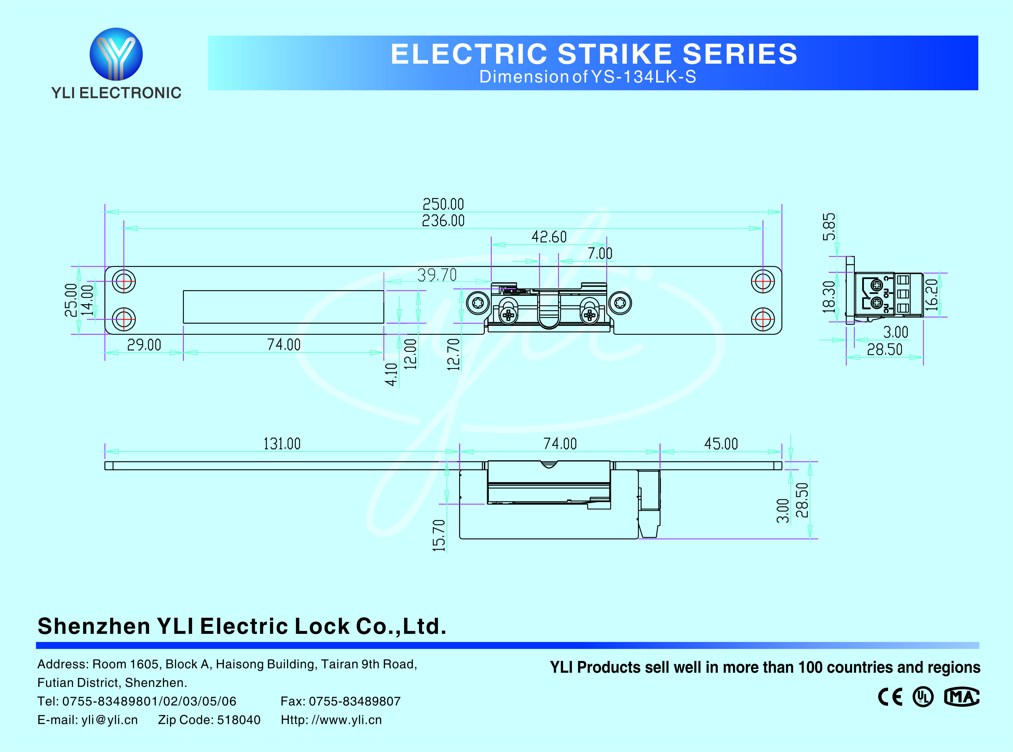 YS-134LK-S/134BLK-S is narrow type adjustable European electric strike with long face plate, which is designed for narrow wooden door, narrow metal door and so on. The lock tongue use zinc alloy die-casting, panel use 304 stainless steel, which is durable and can withstand 300kg static strength. Security type: Fail-Secure. Special design: adjust the mechanical switch on the lock body to make the electric strike keep unlocked (it remains unlocked no matter the power is on or off). It have door signal output (NO, NC COM).