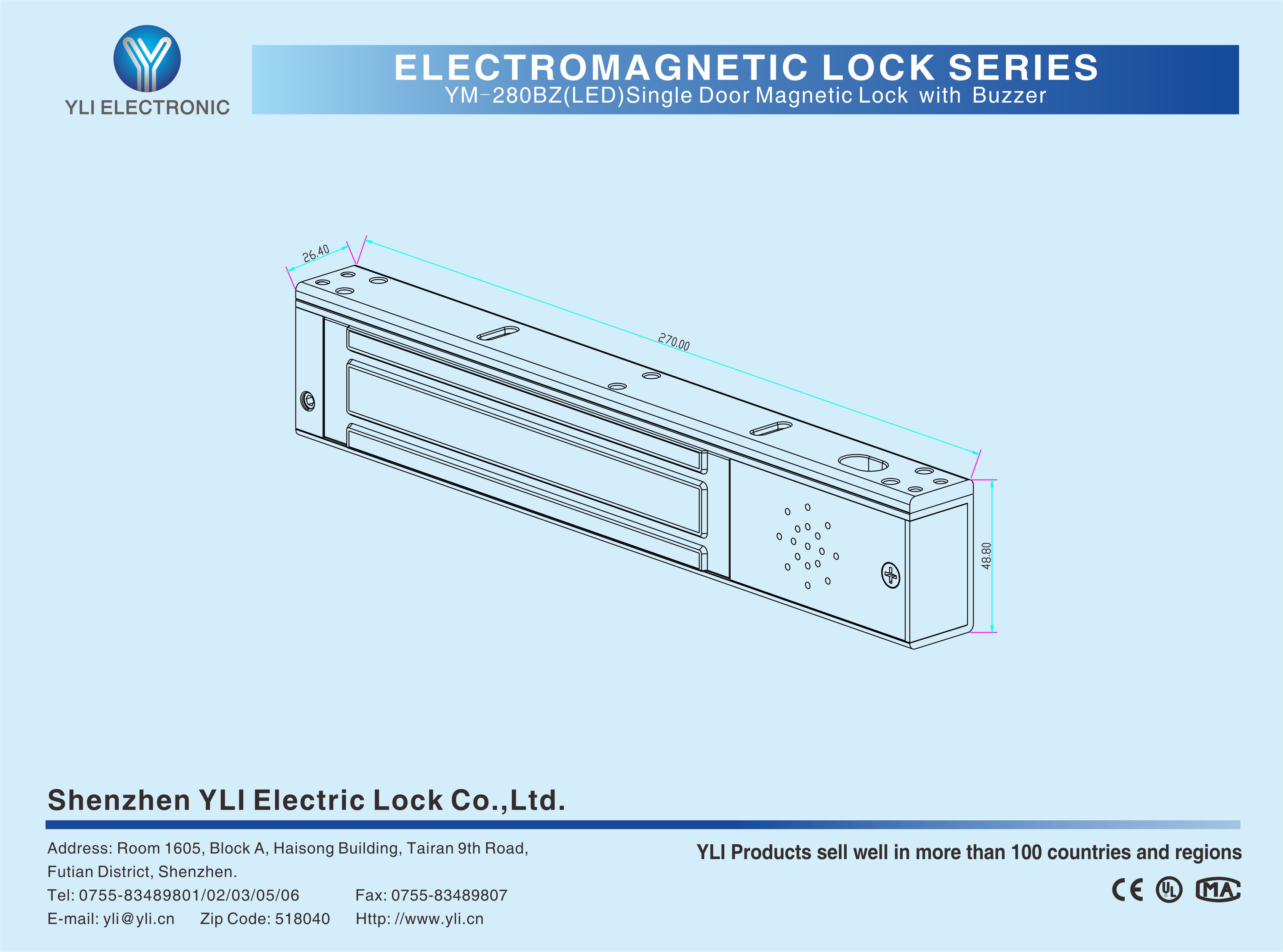 YM-280BZ(LED) Single door magnetic lock is designed for wooden door, metal door, glass door and fireproof door. it is equipped with a set of buzzer alarm. The internal buzzer alarm will sound until the door is closed if the lock is not closed within the set time (0-20 seconds). There is a set of lock status signal (NO/NC/COM) output contacts, which provides real-time feedback for the access control system.The lock body is equipped with a large LED light. The green light indicates unlocking, and the red light indicates locking. YLl magnetic lock cores are produced with robotic laser welding technology, providing 2 to 3 times stronger impact resistance and torsional resistance than conventional production processes. The surface is treated with the internationally leading electroplating process and the lock itself has passed the 240-hour salt spray test in the national laboratory, achieving excellent performance of anti-oxidation, anti-rust and anti-corrosion. Our company offers a complete range of brackets for different locks.