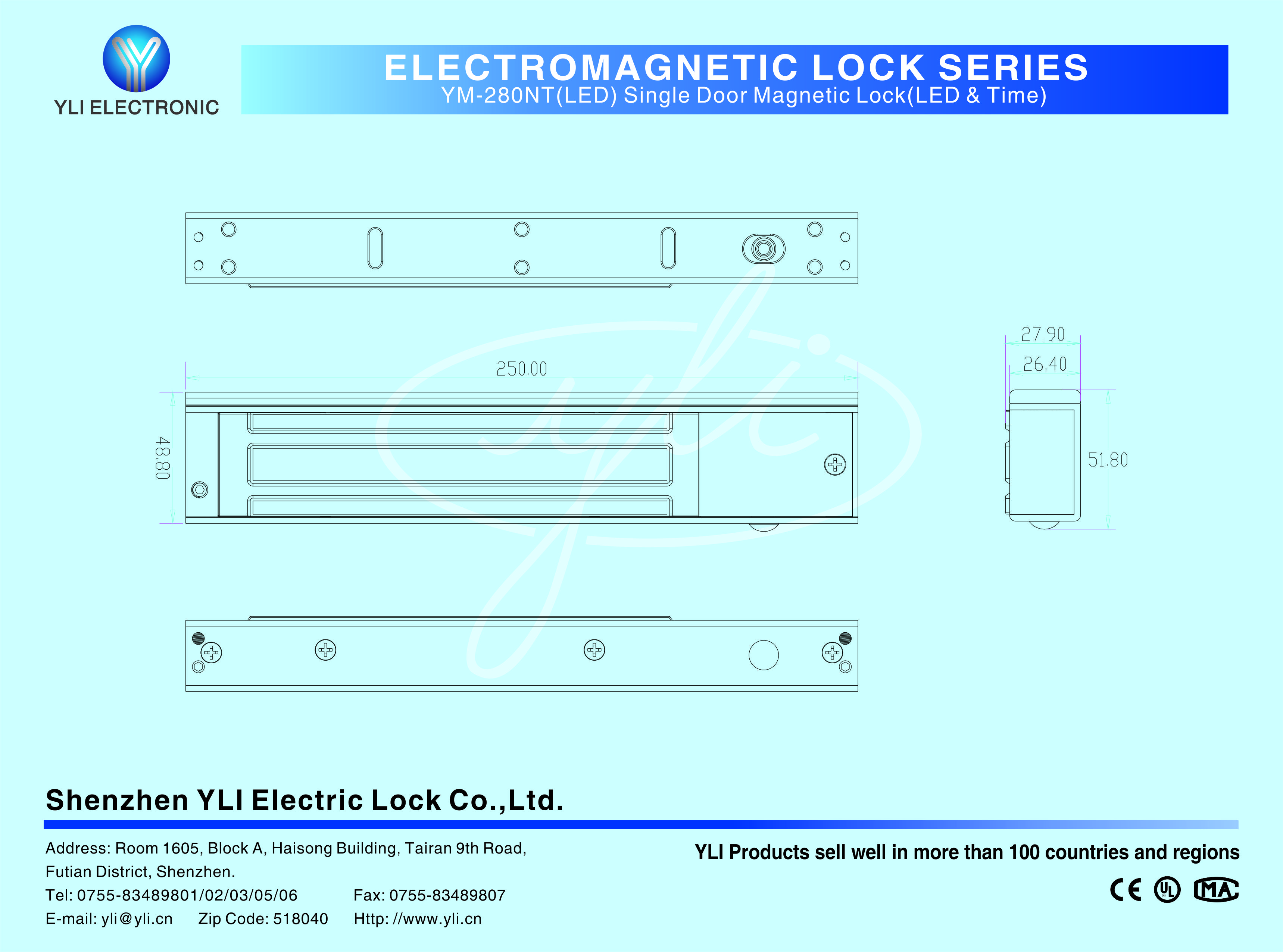 YM-280NT(LED) Single door magnetic lock is designed for wooden door, metal door, glass door and fireproof door. It has an adjustable time delay function of 0/3/6/9 seconds. There is a set of lock status signal (NO/NC/COM) output contacts, which provides real-time feedback for the access control system. The lock body is equipped with a large LED light. The green light indicates unlocking , and the red light indicates locking. YLl magnetic lock cores are produced with robotic laser welding technology.providing 2 to 3 times stronger impact resistance and torsional resistance than conventional production processes. The surface is treated with the internationally leading electroplating process and the lock itself has passed the 240-hour salt spray test in the national laboratory, achieving excellent performance of anti-oxidation,anti-rust and anti-corrosion, Our company offers a complete range of brackets for different locks.