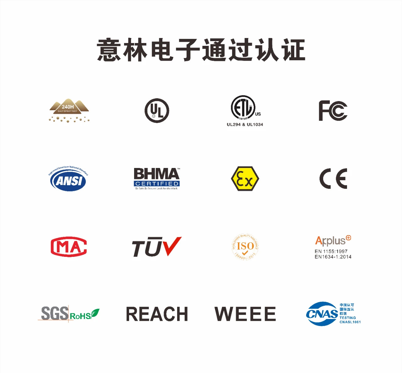 過線保護(hù)器、門禁專用遙控器、消防器材及防爆器材等一系列明星產(chǎn)品。其中,意林電子磁力鎖系列和電鎖口系列,是全國門禁電鎖行業(yè)首家通過美國UL294/UL1034認(rèn)證的產(chǎn)品。