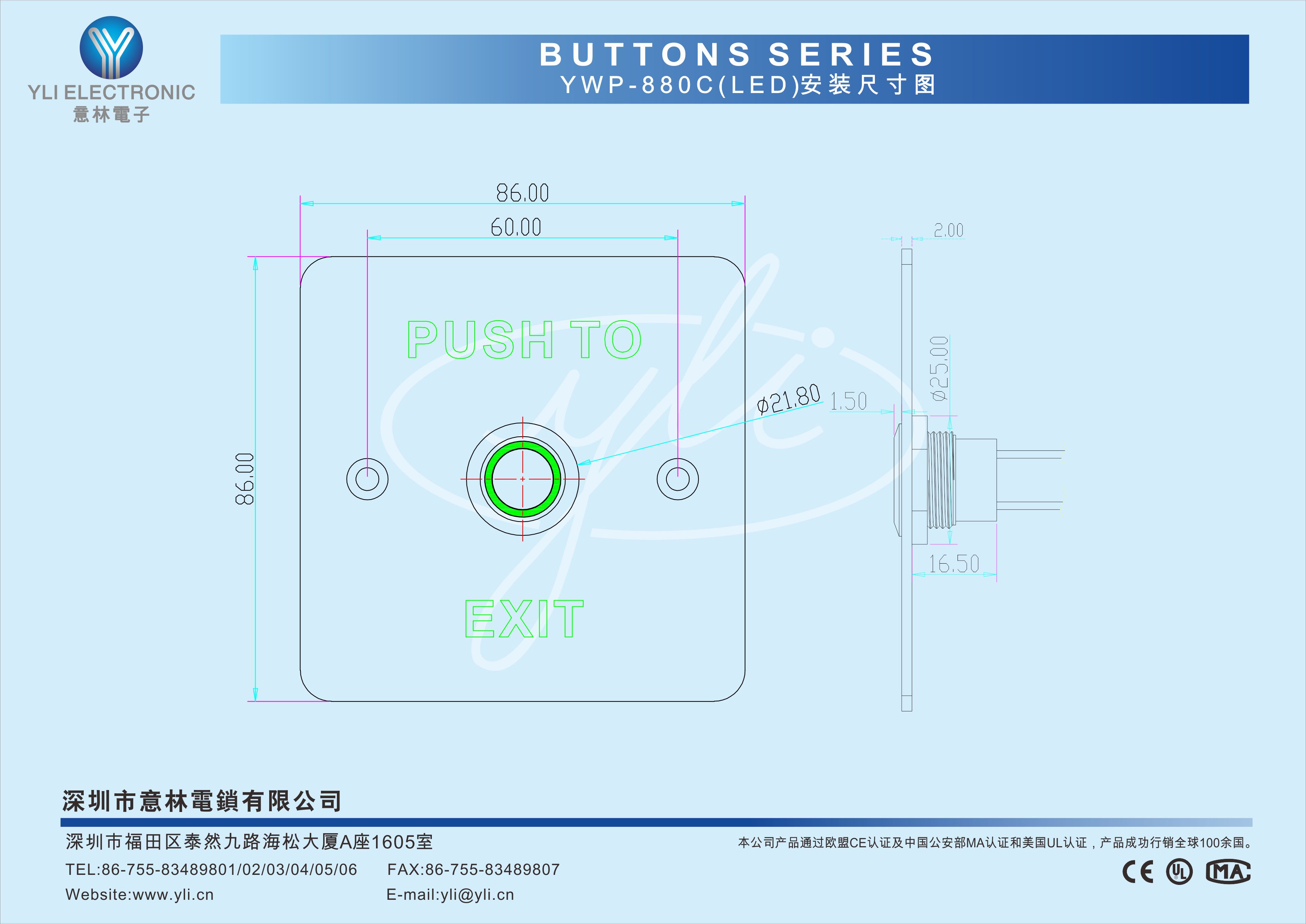 YWP-880C(LED)是一款防水型按壓式門禁專用開關,防雨水設計,LED燈顯示:通電亮燈,常亮綠色。面板304不銹鋼拉絲工藝處理,金屬材質按鈕,經CNC車床加工后拋光而成,100萬次耐用測試合格,堅固耐用,產品美觀。門禁系統配套的最佳選擇。