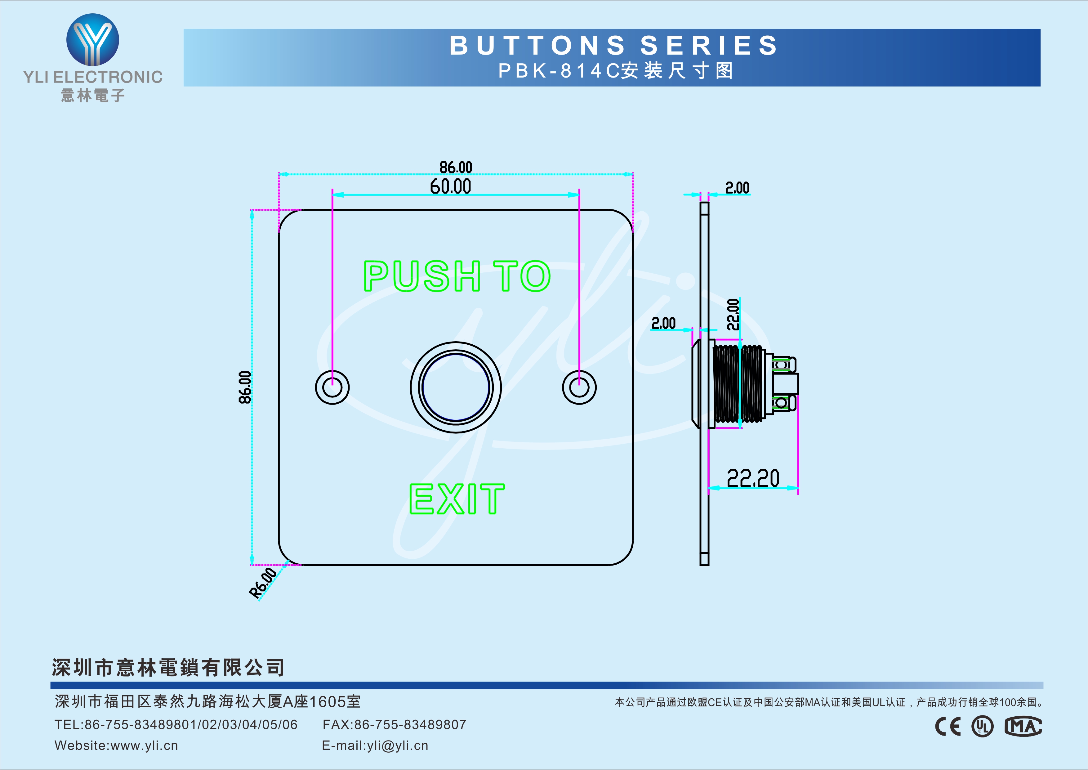 PBK-814C是一款耐用型按壓式不銹鋼門禁專用開關,面板選用304不銹鋼拉絲工藝,按鈕選用銅鍍鉻,經CNC車床加工后拋光而成,五十萬次老化測試合格,產品美觀、耐用,是門禁系統配套的最佳選擇。