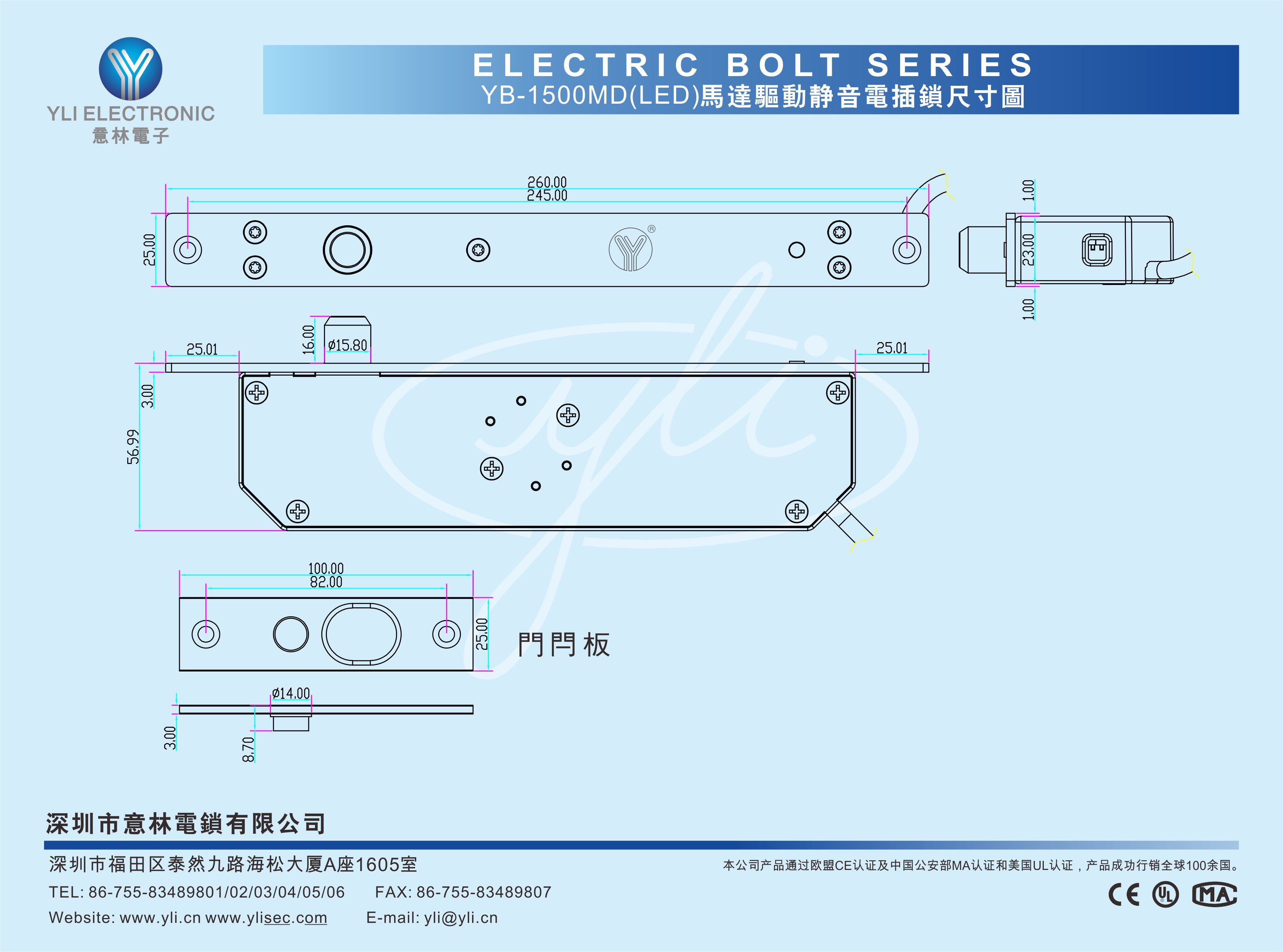 YB-1500MD(LED)是一款馬達驅動靜音電插鎖,通過減速電機驅動鎖舌伸縮,實現上鎖和開鎖功能;減速電機驅動電插鎖的鎖舌伸縮的力度更大,當門扇輕微變形或偏位時,電插鎖減速電機強勁的驅動鎖舌插出,將門位拉正可實現靜音上鎖或開鎖;本型號電插鎖在上鎖和開鎖狀后消耗電流超低,節能環保,本產品已申請專利保護,仿冒必究!