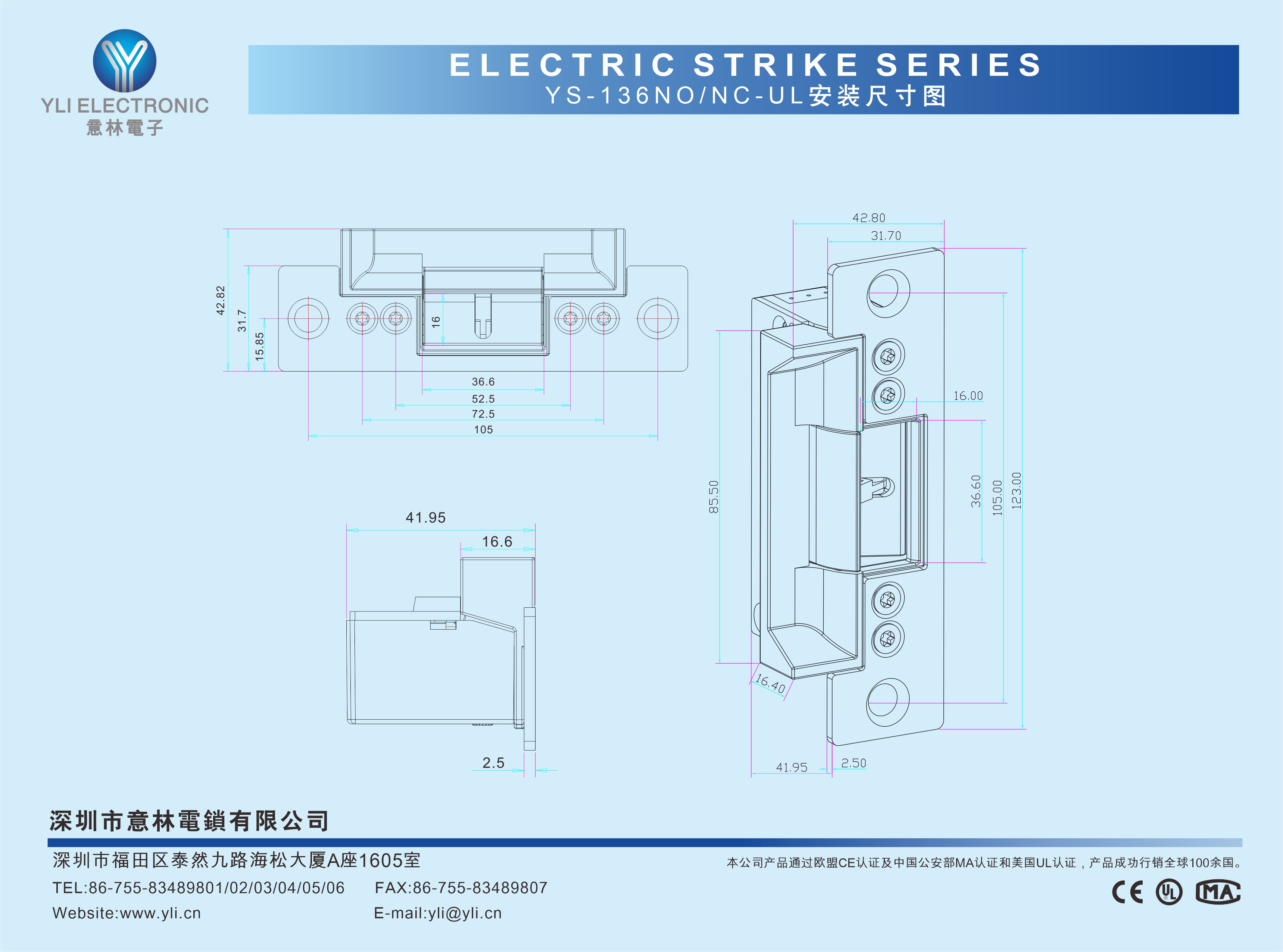 YS-136NO/NC-UL 美規堅固型電鎖口,是專為美規機械鎖配套應用而設計,適用于一般木門、金屬門、PVC門等。可以達到平時“電控”與緊急時“手動”開門雙功能,本型號電鎖口采用加強型連續工作耐用電磁閥,(連續通電測試100萬次合格),(NO,斷電上鎖)及(NC,斷電開鎖)可選擇,鎖舌采用304不銹鋼材質,內連動部件采用304不銹鋼加強處理.