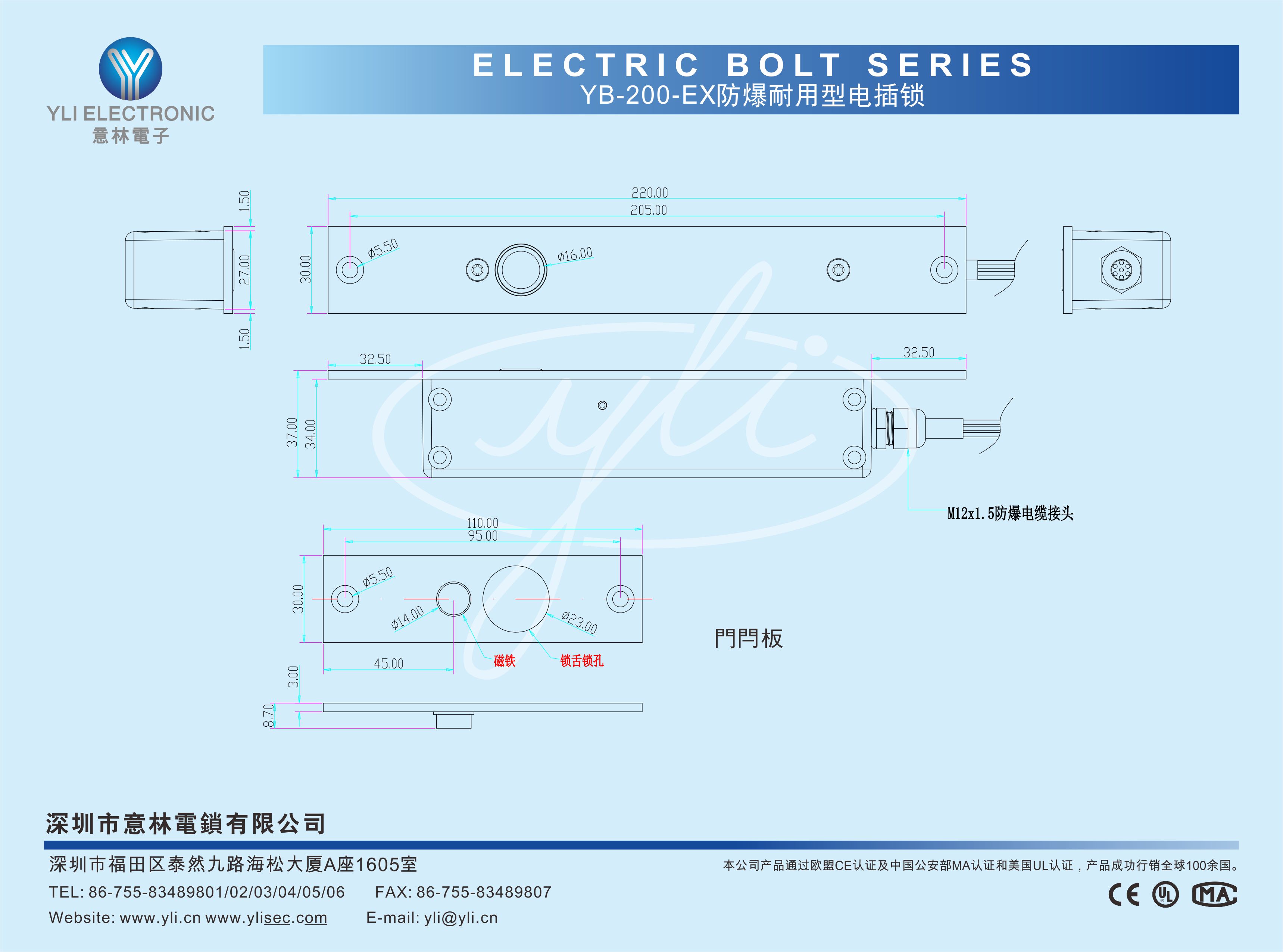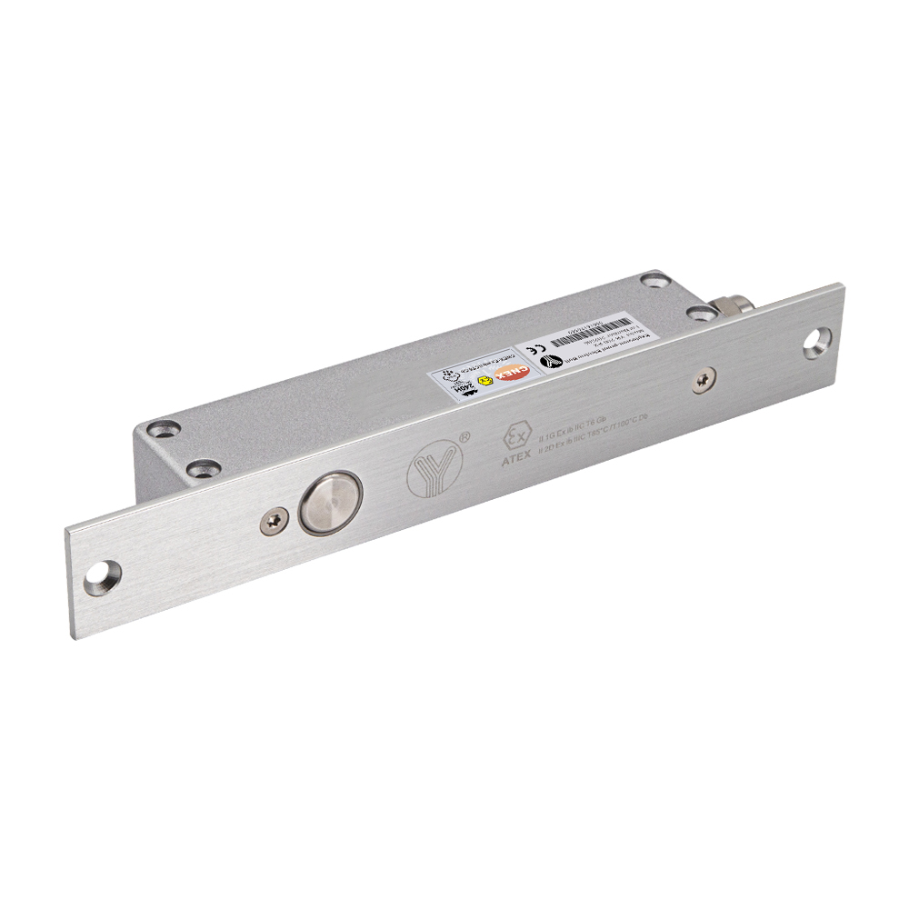 YB-200-EX 防爆電插鎖, 是一種能夠使用在爆炸性氣體及粉塵環境中采用澆封防爆型式的電插鎖。嚴格按照國家標準 GB/T3836.1-2021【爆炸性環境 第 1 部分 設備 通用要求】及GB/T3836.9-2021【爆炸性環境 第 9部分 由澆封型“m”保護的設備】中的有關規定設計和生產制造,產品經國家指定的防爆產品檢測機構檢驗合格,并持有防爆合格證備查。鎖舌采用整體式304不銹鋼實心棒材,經CNC車床精加工而成,工藝精湛,最高可承受800kg沖擊。采用特殊防水處理,IP67防護等級,浸水后功能仍可正常使用室內室外均可安裝,堅固耐用。防入侵設計,實時偵察安全防盜鎖舌上鎖后,自動切斷干簧管偵察功能,避免人為截斷門閂板的磁鐵與鎖體干簧管的感應;兩組信號輸出,門狀態信號 NO、COM,鎖狀態信號NO、NC、COM,實時偵測門鎖狀態反饋,鎖舌完全插出才有鎖信號輸出。專業設計的耐用型電磁閥,使用壽命超過50萬次測試合格。本產品廣泛應用于石油石化、港口碼頭、鉆井平臺、醫藥化工、航天軍工、糧食加工,機械制造等場所。在使用本產品前請認真閱讀以下內容,以保證您能正確使用,避免因不當使用和操作引起或可能產生安全事故,敬請留意。