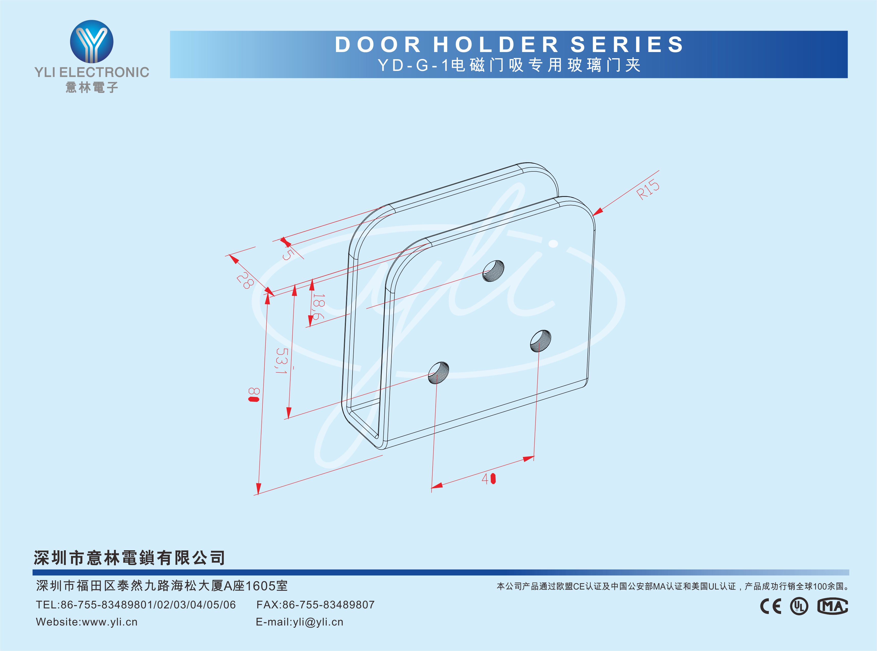 特別專用U型玻璃門夾,玻璃無需開孔使用特色設計,電磁門吸直接與門夾吸合選用加厚鋼板,堅固耐用專業消防工程指定使用產品