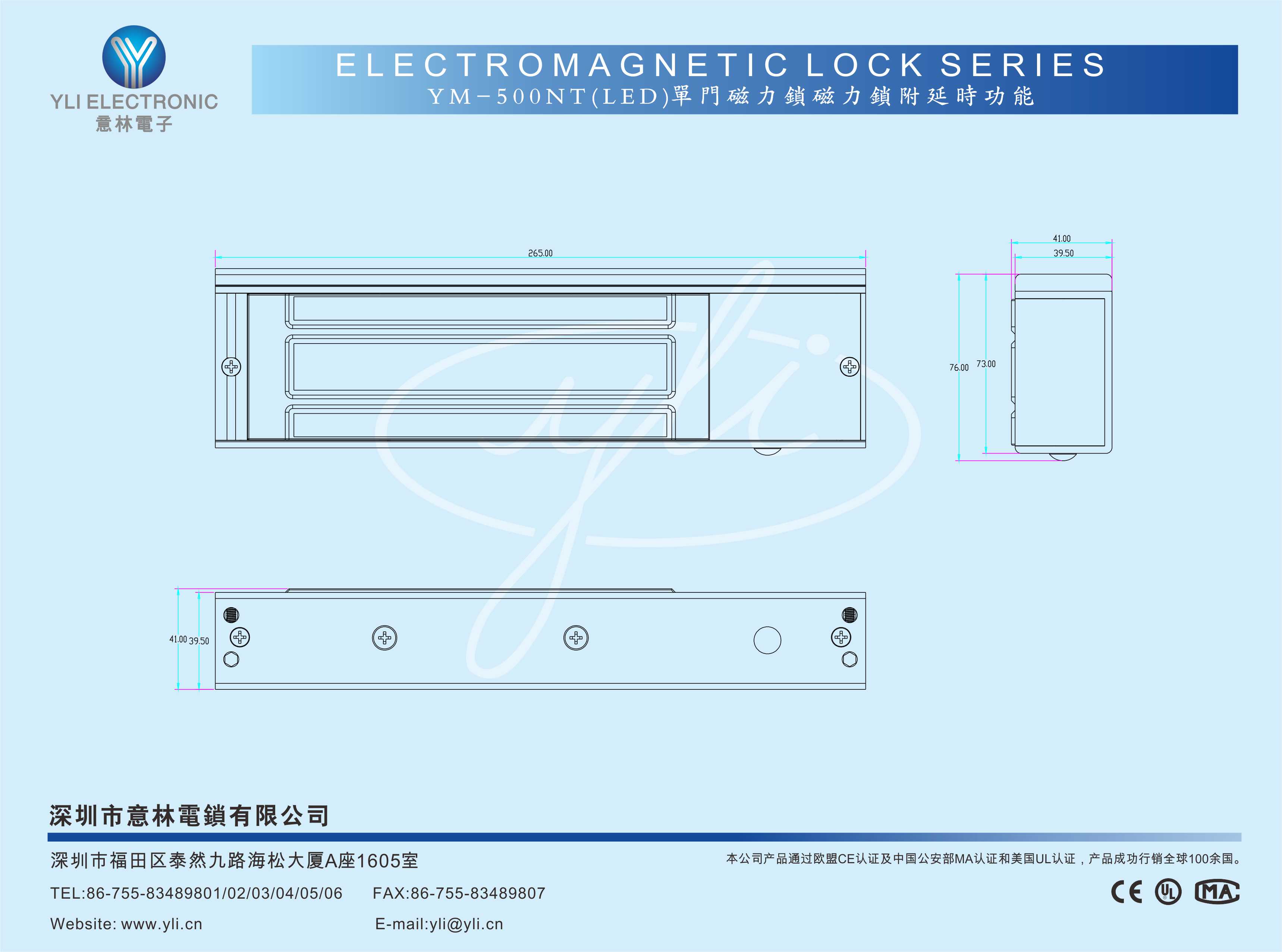 YM-500NT(LED)-UL單門磁力鎖附延時功能,通過美國UL294(門禁系統及組件安全標準)及UL1034(防盜電子鎖機械裝置安全標準)認證,產品在安全性、耐用性和環境適應性等方面,經過了全球最嚴格標準的檢驗,並達到及超過了該標準的要求,為建筑師、顧問工程師、系統集成商和終端用戶提供了權威、客觀的產品性能和質量保證。意林磁力鎖鎖芯特殊加強焊接工藝,抗撞擊力及抗扭力比常規生產工藝強2-3倍,更堅固耐用。表面處理,通過國家實驗室240小時鹽霧測試,達到防氧化、防銹、防腐性能。適用于日常辦公場所或沿海鹽霧,潮濕(如:地鐵,機場,核電站,跨海大橋,港口碼頭,醫療機構,沿海城市建筑)等場景使用。