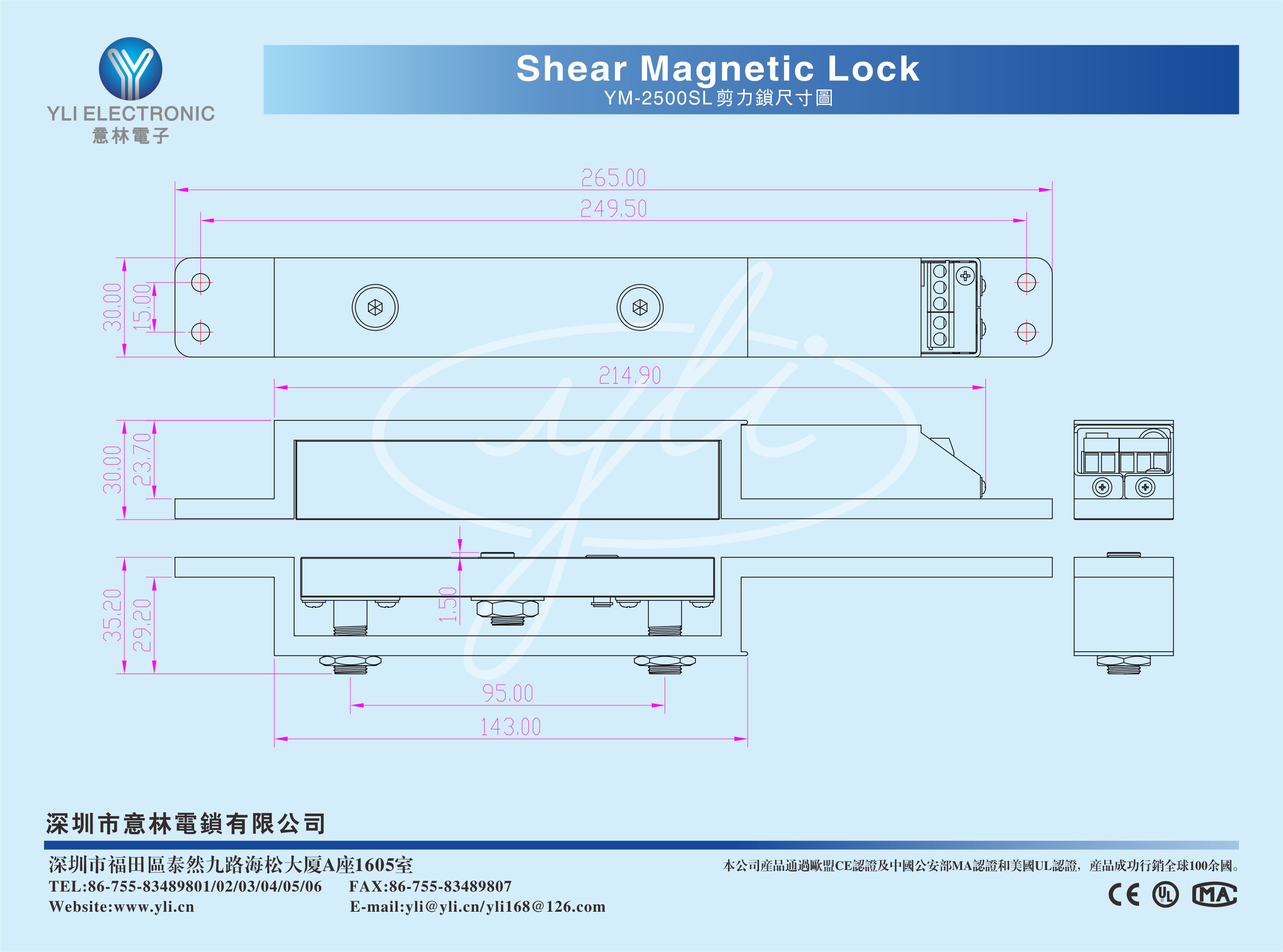 YM-2500SL是一款智能堅固型的磁力式剪力鎖。鎖體采用整體式電磁專用型材料經特制設備精工而成,綜合磁力及插銷式的優化設計,可承受1200kg沖擊,鎖體部件全采用金屬結構,在60℃高溫及零下20℃嚴寒的惡劣環境下可正常使用,具有門位不正重復上鎖智能電路及開門時間延遲,門位偵測信號輸出等設計。集多功能綜合于一體,是一款有效滿足窄框門、金屬門、木門、玻璃門、PVC門等高安保需求的專業門禁工程最佳產品。